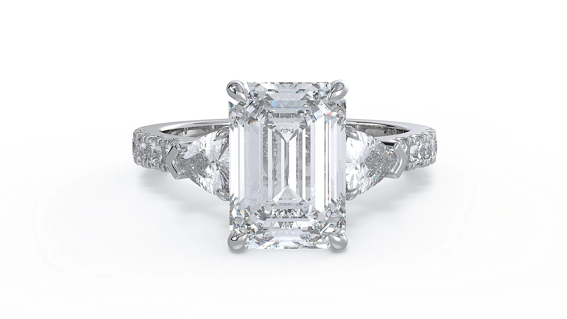 This bespoke Christopher Stoner design features a classic and timeless setting for the stunning 3.00ct emerald-cut diamond, which is flanked by two trilliant-cut diamonds. A respectful nod to Art Deco grandeur with a contemporary edge, complemented by extra sparkle in the diamond-set shoulders.